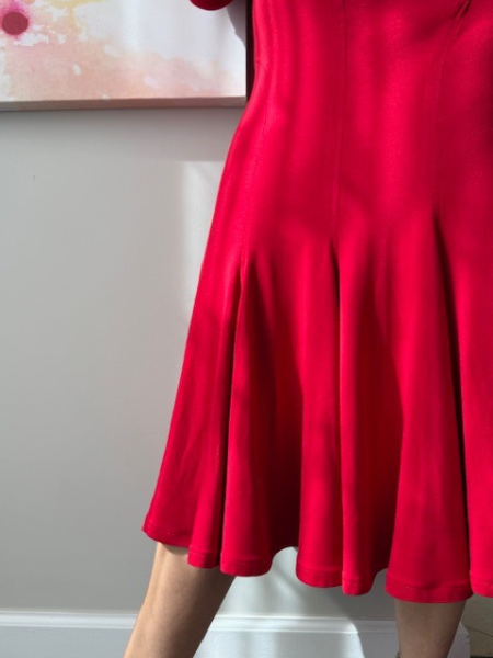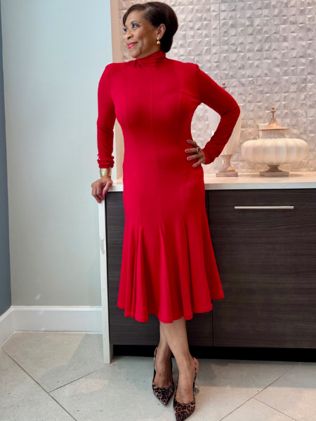 I love a knit dress, especially in this crowd favorite, 11 oz rayon jersey knit. Since it’s still cold, especially in the evenings, the long sleeves and ruched turtleneck are perfect for staying warm without sacrificing style. Below are my notes on both the fabric and pattern.