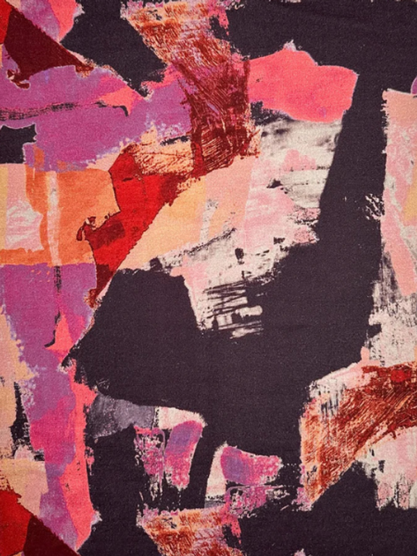 Featuring a digital print in plum, magenta, rust, copper red, and harvest gold, this fabric is as eye-catching as it is versatile. With a soft, smooth hand and moderate drape, this digital print fabric weighs in at 200 gsm with a 14-3/4" vertical repeat. Its crosswise and lengthwise stretch of 50% makes it an excellent choice for sewing comfortable, stylish garments such as t-shirts, dresses with ruching, or pull-on skirts. Manufactures care instructions: Wash delicate cold, dry flat